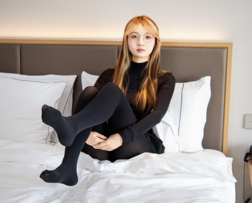足愉心摄影第84期:模特糖豆(搭配:黑色紧身衣、黑色短裙、黑色丝袜、小皮鞋、裸足)