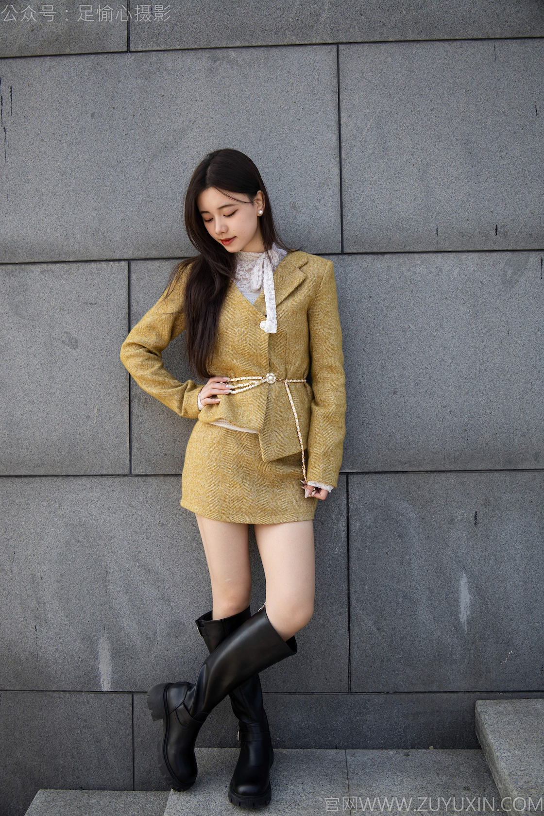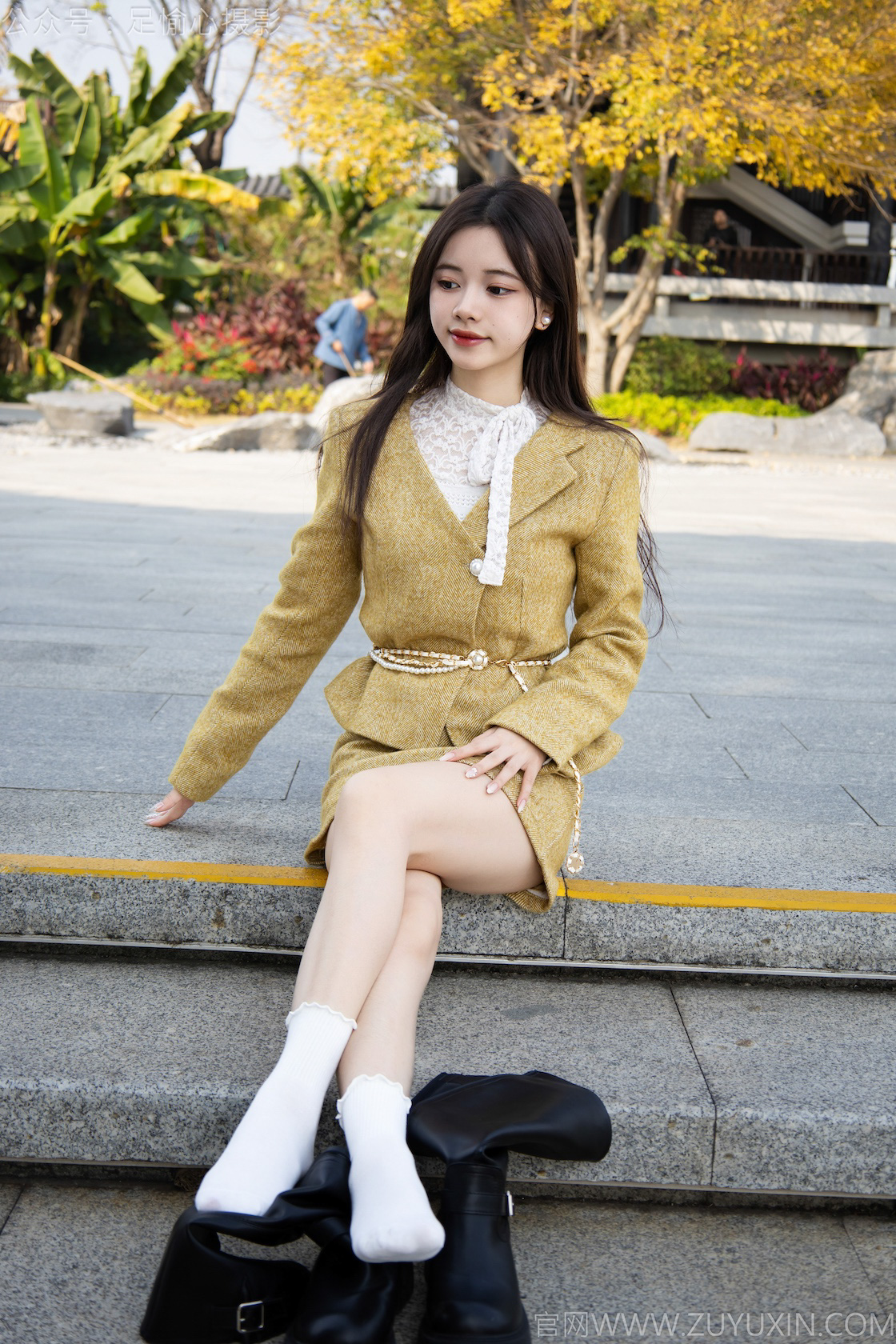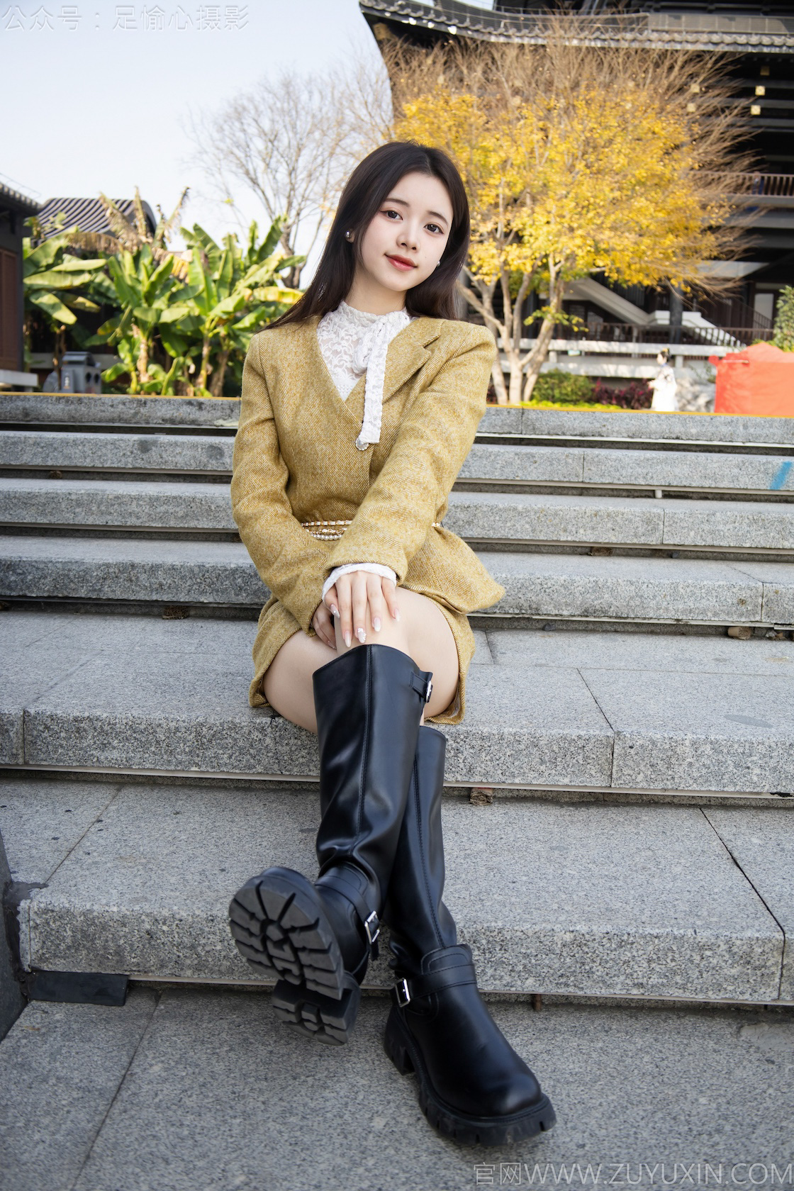 搭配内容:黄色连衣裙,黑色长靴、白色棉袜、裸足