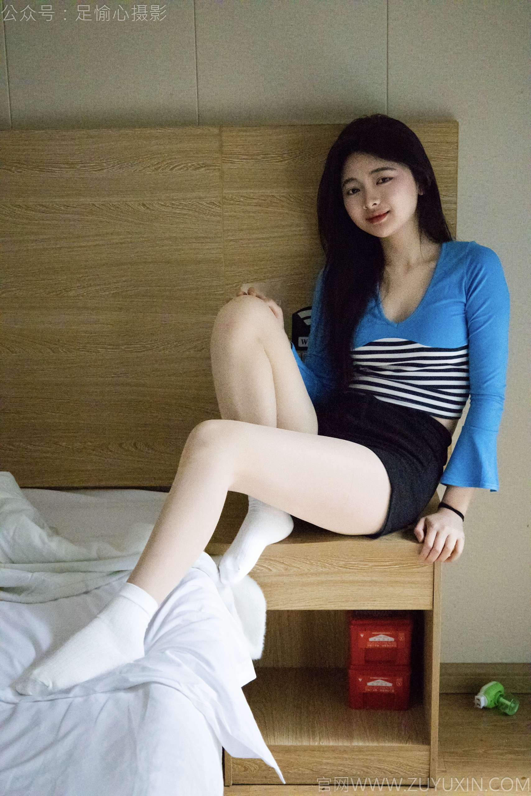 搭配内容:蓝色衬衫、灰色短裙、小皮鞋、白色棉袜、裸足