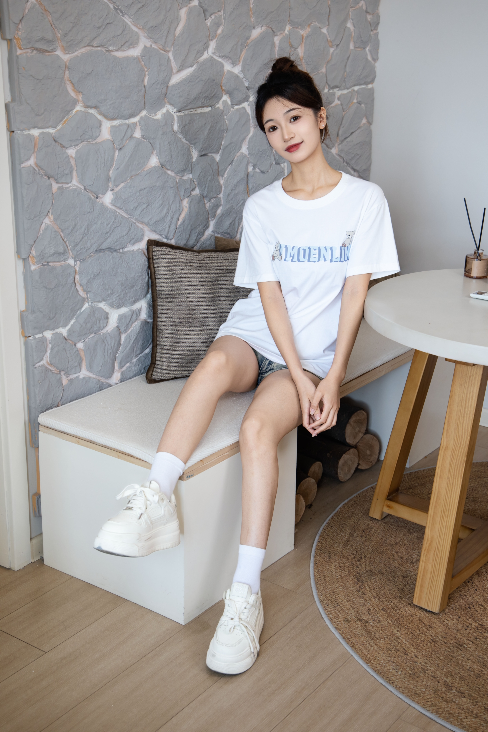 搭配内容:白色体恤、牛仔短裤、运动板鞋、白色棉袜、裸足