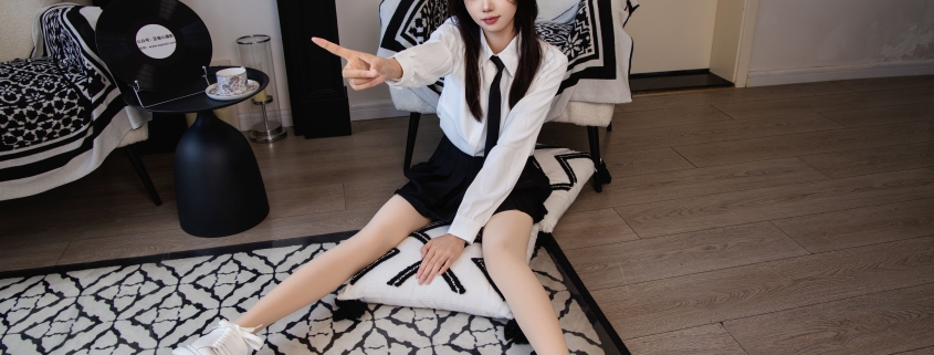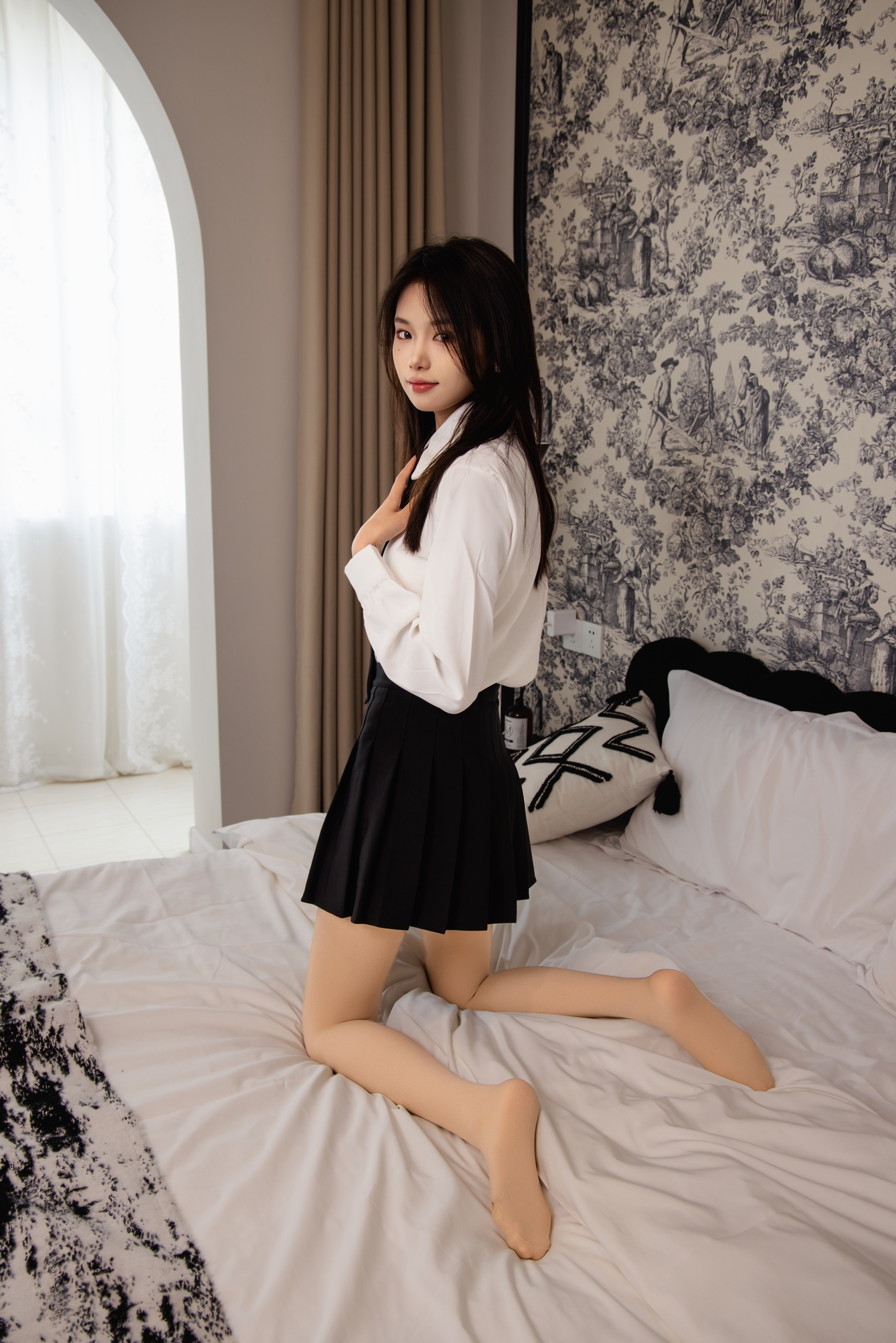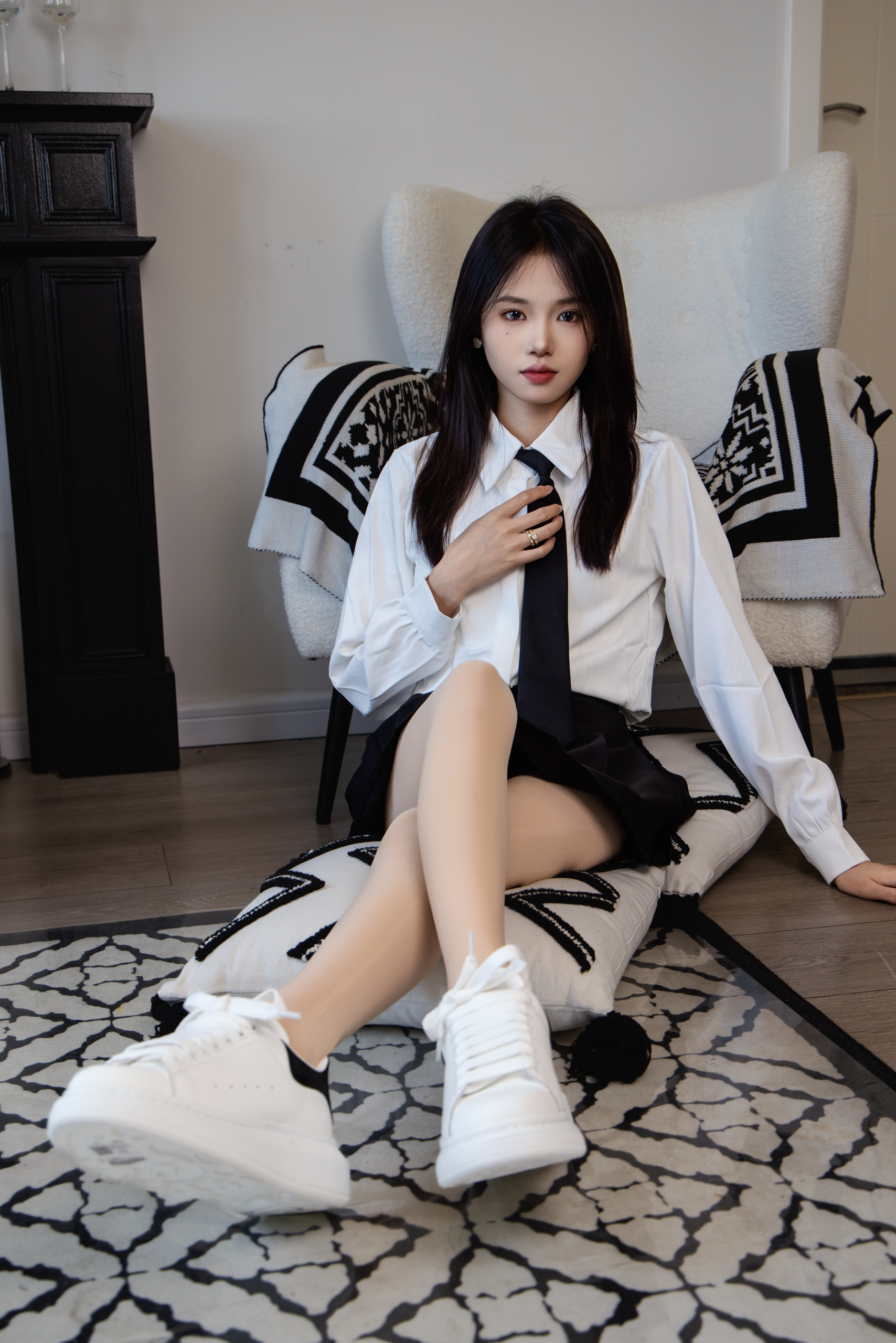 搭配内容:白色衬衫、黑色百褶裙、白色高跟鞋、麦昆鞋、肉色丝袜