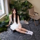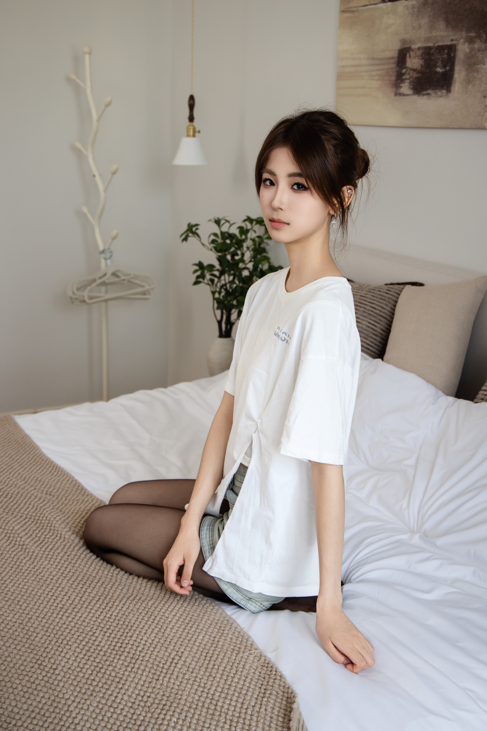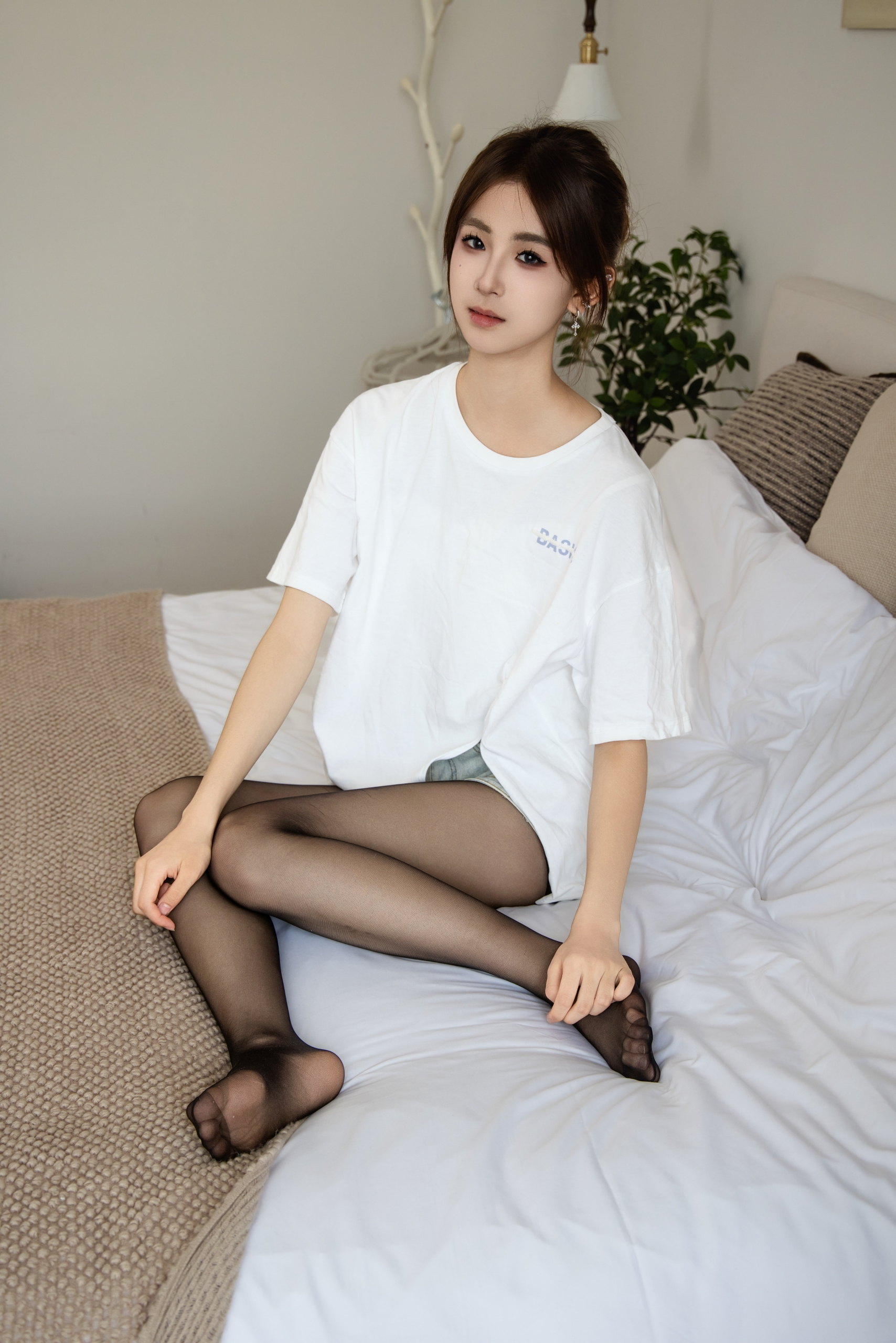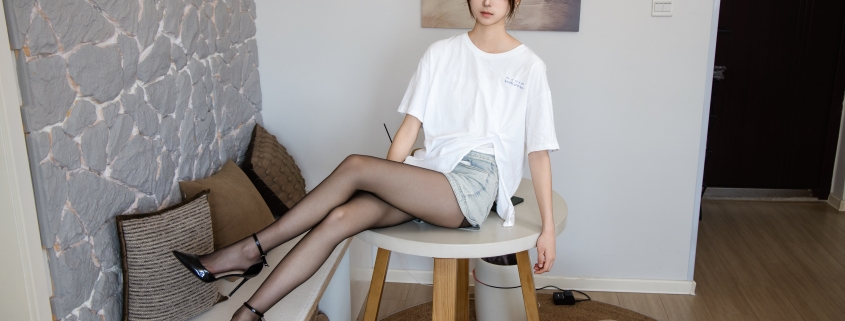 搭配内容:白色体恤、牛仔短裤、黑色丝袜、高跟鞋