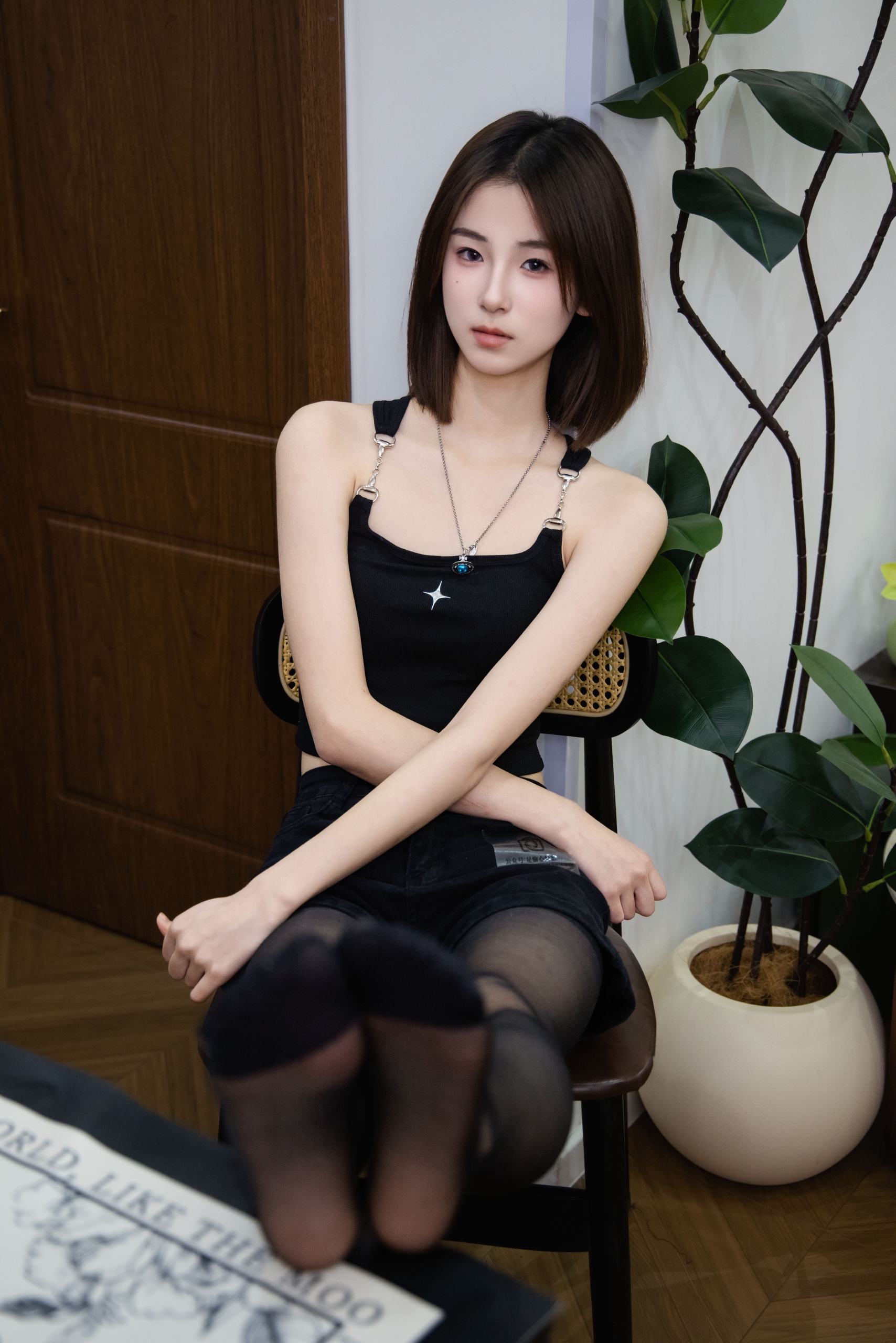 搭配内容:黑色吊带、黑色短裤、黑色丝袜、长筒高跟鞋