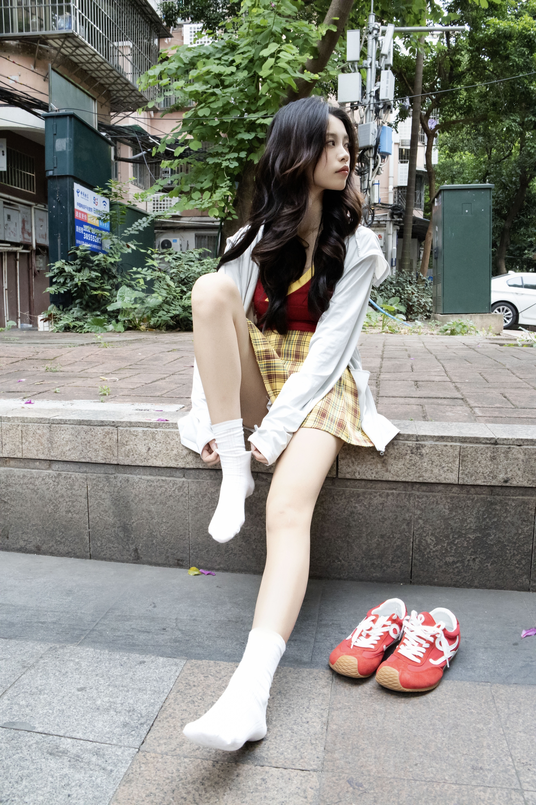 搭配内容:红色T恤、黄色短裙、红色运动鞋、白色棉袜、裸足
